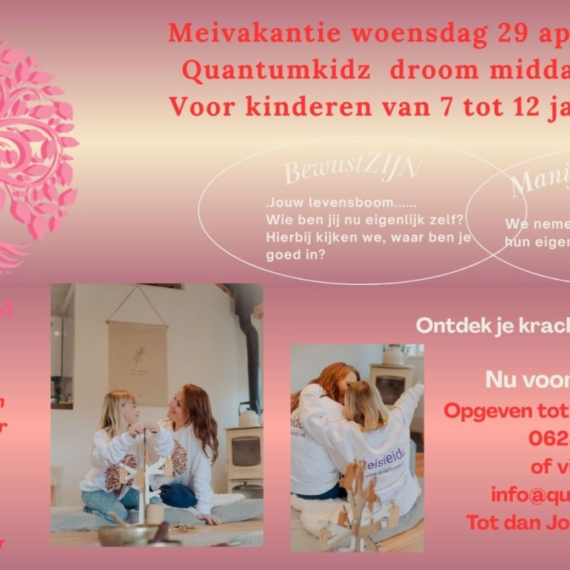 **Quantumkidz Droommiddag** nemen we kinderen (7 t/m 12 creatief, manifesteren, meditatie.